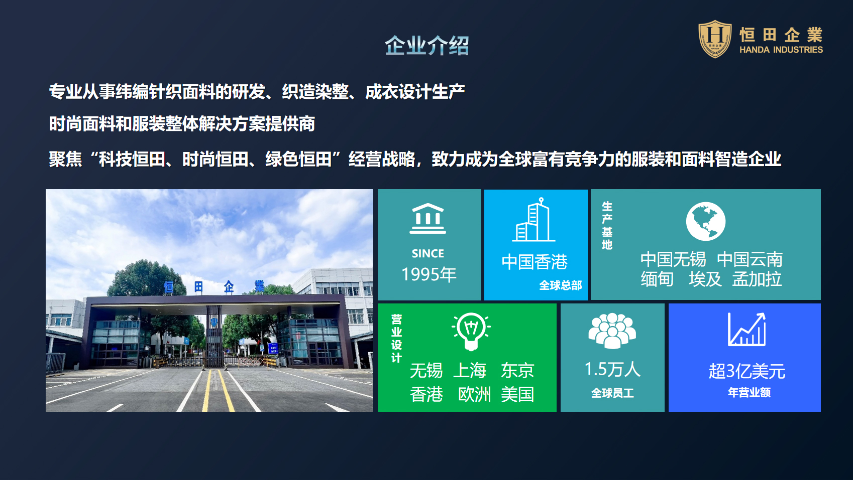 香港恒田企业有限公司(以下简称恒田企业)成立于1995年,为香港全资有限责任公司,专业从事纬编针织面料的研发、织造染整、成衣设计生产,现有海内外员工近1.4万人。企业以香港总部为大本营,在中国内地、日本、纽约、欧洲、缅甸、埃及等全球多个国家城市设有营业部和生产基地,以点带面,形成辐射全球市场的服务体系。同时,恒田企业不断加强智能制造、创新管理和可持续发展,推进企业转型升级。