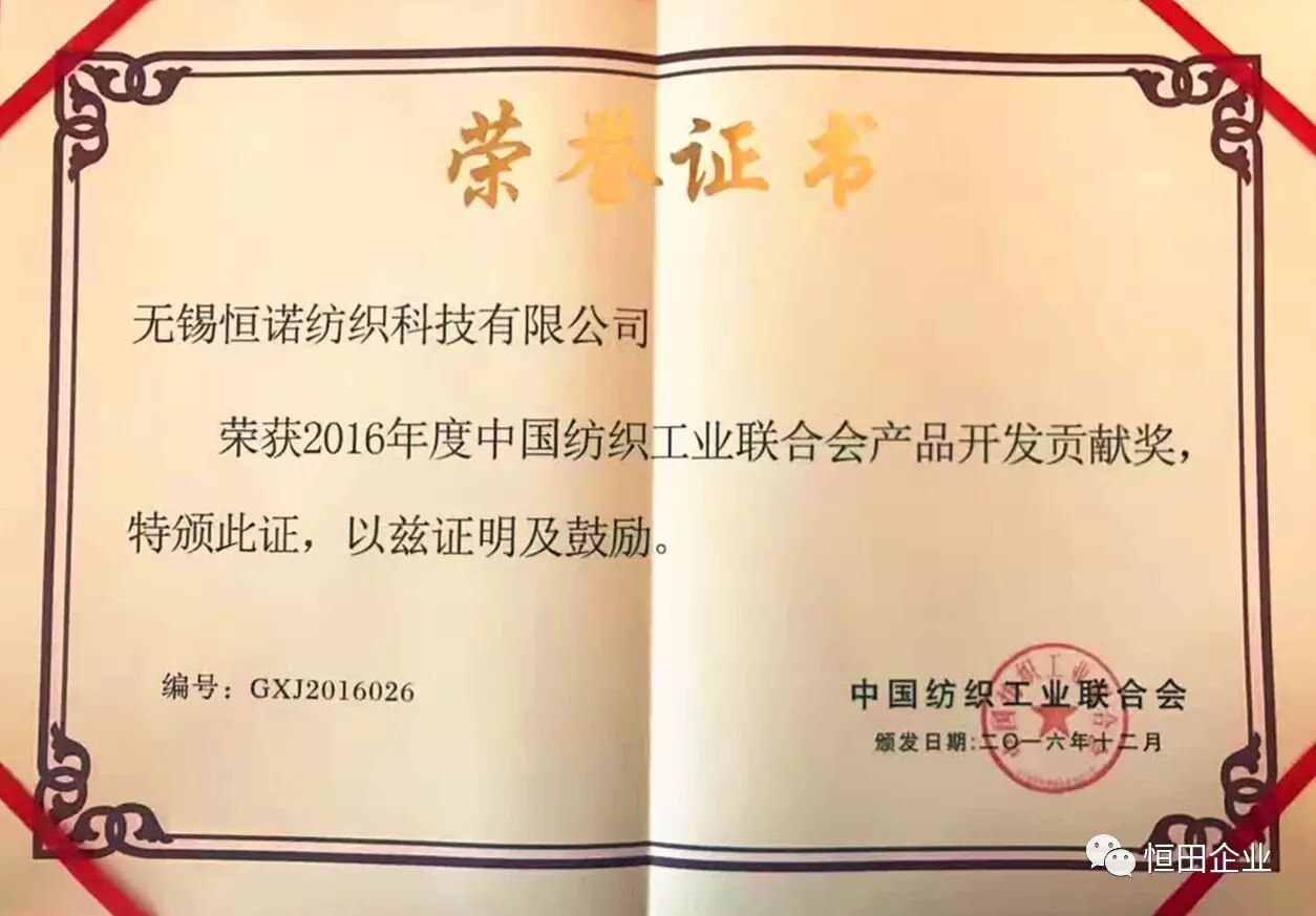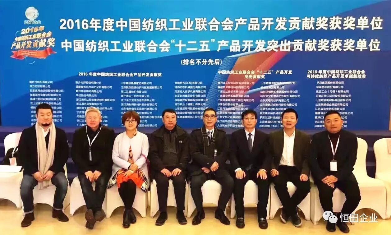 12月12日,主题为“新契机、新优势、新动能”的2016中国纺织创新年会在北京召开,无锡恒诺纺织科技有限公司作为国家功能性面料开发基地企业应邀参加会议,并荣获“2016中国纺织产品开发贡献奖”,这也是恒诺科技继2015年获得“社会责任企业”后第二次获得产品开发贡献奖。
