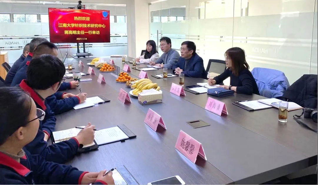 2021年1月14日下午,江南大学针织技术研究中心主任蒋高明教授、丛洪莲教授、马丕波教授、董智佳副教授和博士生刘海桑到访恒田企业。恒田企业董事长韩春、总裁乔亮、高级副总裁姜延慧、恒诺科技总经理冯培生等对蒋高明教授一行的到访进行了热情接待。