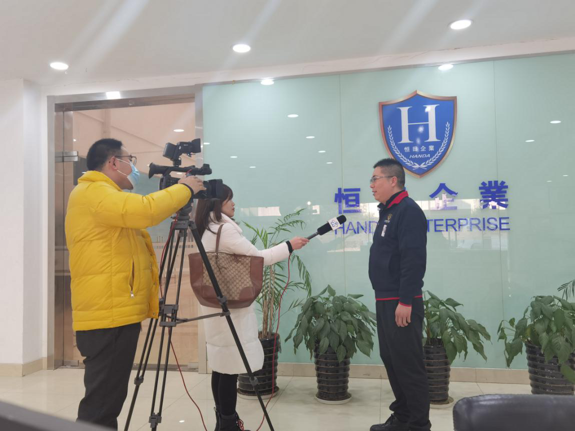 恒田企业高级副总裁姜延慧接受采访并介绍了企业防疫工作情况,重点介绍了春节期间员工留厂的福利政策,企业对不返乡过节的一线员工进行奖励,满足企业补贴标准的一线员工可得到3000元至5000元的奖励,加入恒田企业的一线新员工如满足条件亦可享受相关补贴和奖励。同时,春节期间企业将举办看电影、运动等丰富多彩的活动,食堂也将免费提供一日三餐。