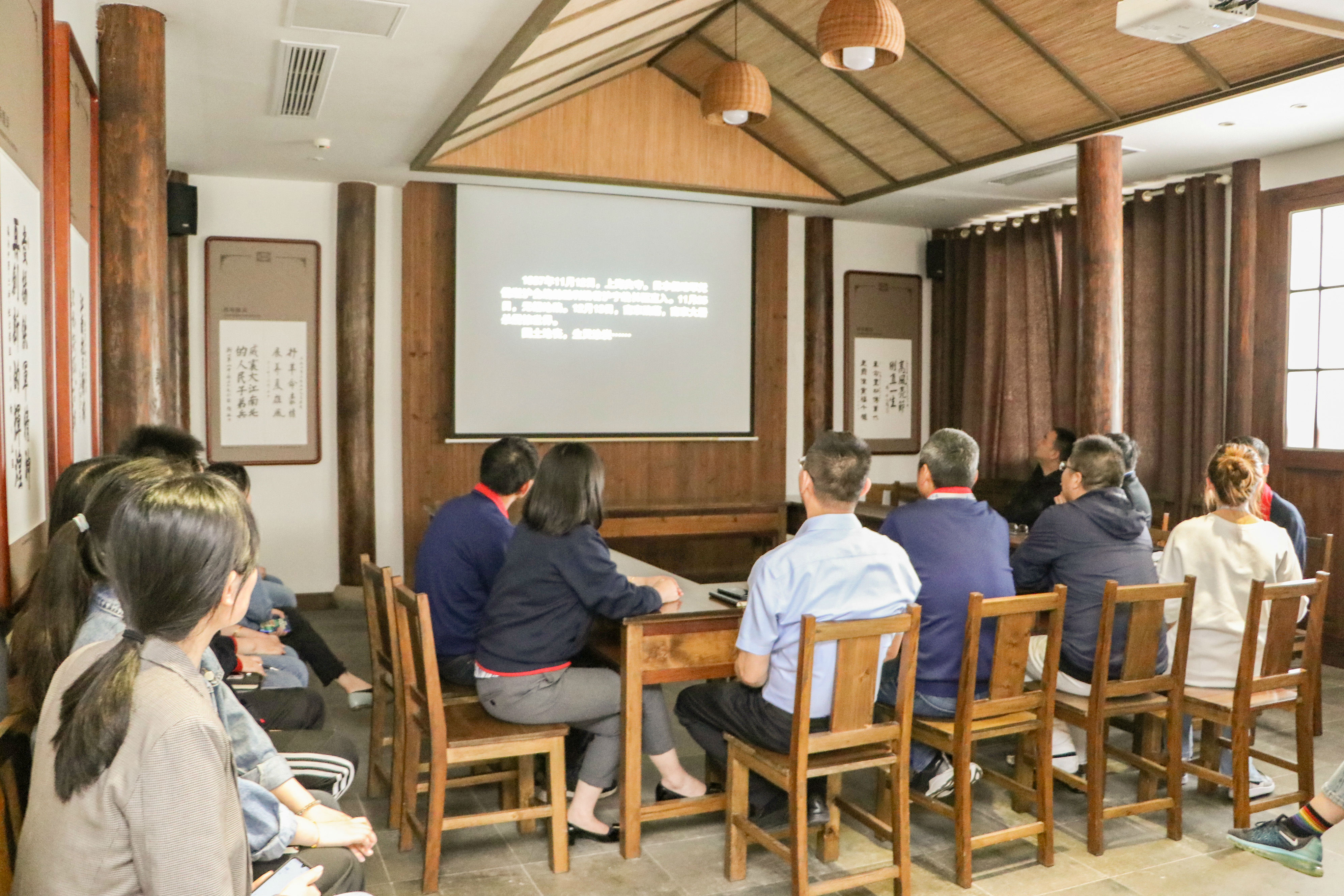参观最后,大家一起观看了新四军东进无锡在敌后开展抗日游击战的宣传片。影片主要讲述了由谭震林同志率领下的江南抗日救国军东路指挥部在无锡地区通过发动广大民众的抗日热情,不断壮大抗日武装力量,积极推进抗日民主政权建设,发展和巩固了苏南东路地区的抗日游击根据地,开创了敌后抗日斗争的新局面。