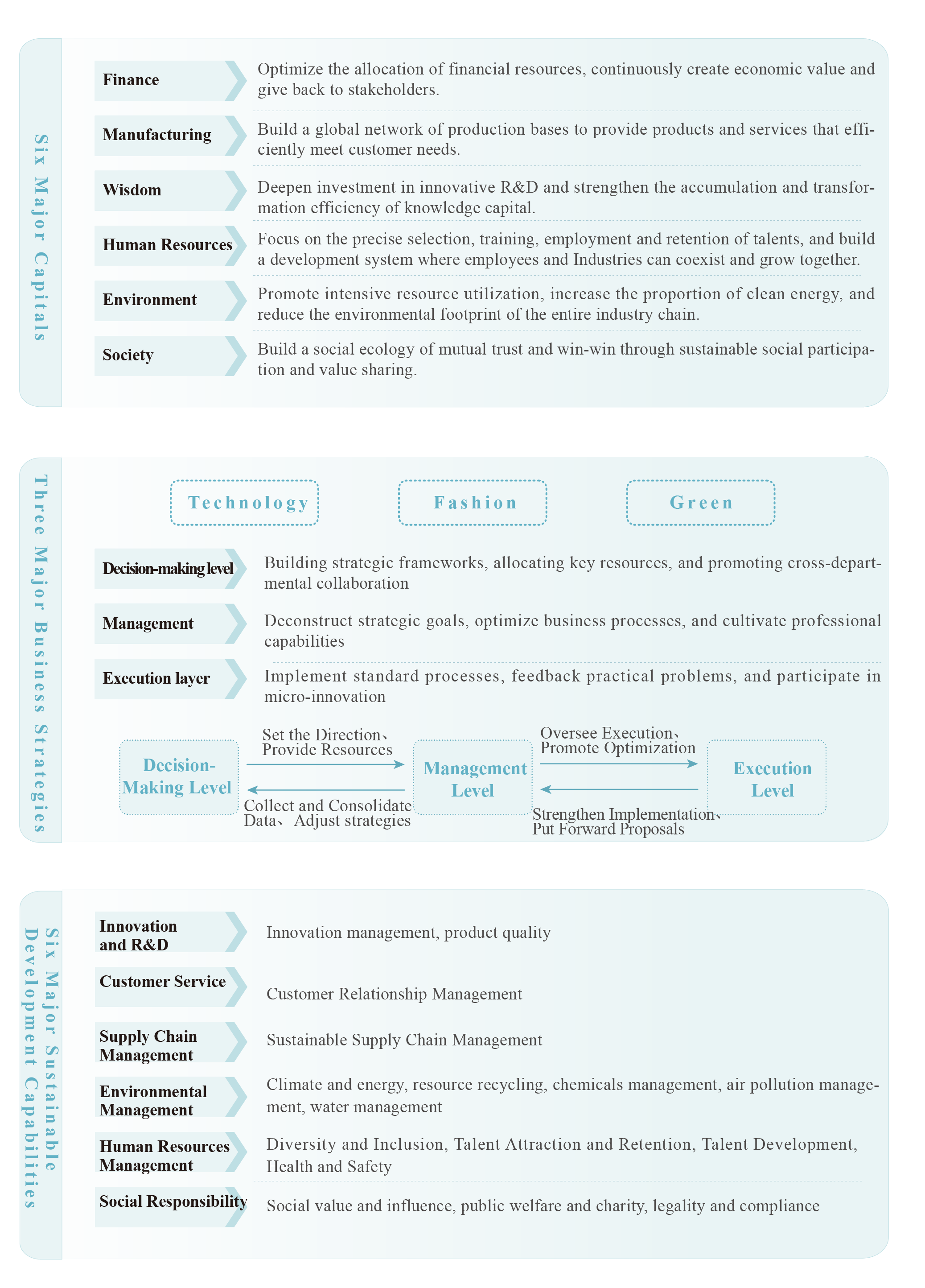 Based on its foundation in the textile and apparel industry, Handa Industries, leveraging its six capitals, deeply integrates its three major corporate operating strategies of "technology, fashion, and green." It has built six sustainable development capabilities: innovative R&D, customer service, supply chain management, environmental management, human resources management, and social responsibility. The company is fully committed to forging three core competitive advantages: "green supply chain, quality innovation, and customer trust." Driving industry upgrades with technological innovation, through the development of environmentally friendly processes and the construction of intelligent production systems, it promotes product iteration and helps customers achieve commercial success. It also fosters the coordinated development of upstream and downstream industries, creates numerous jobs, protects workers' rights, and safeguards employee health and safety. Adhering to the principle of ecological priority, Handa Industries continuously explores energy-saving and emission-reduction technologies, improves resource recycling rates, protects biodiversity, and upholds its commitment to green development. It also actively participates in social welfare initiatives, organizing employee participation in community development and poverty alleviation efforts, uniting the company and society to achieve win-win results for all parties. Guided by the United Nations Sustainable Development Goals, Handa Industries systematically evaluates its comprehensive contribution to the value chain. It is committed to becoming a benchmark company that promotes sustainable development in the industry and enhances social welfare. It demonstrates its responsibility through concrete actions, creates lasting value for stakeholders, and jointly draws a new blueprint for sustainable development.
