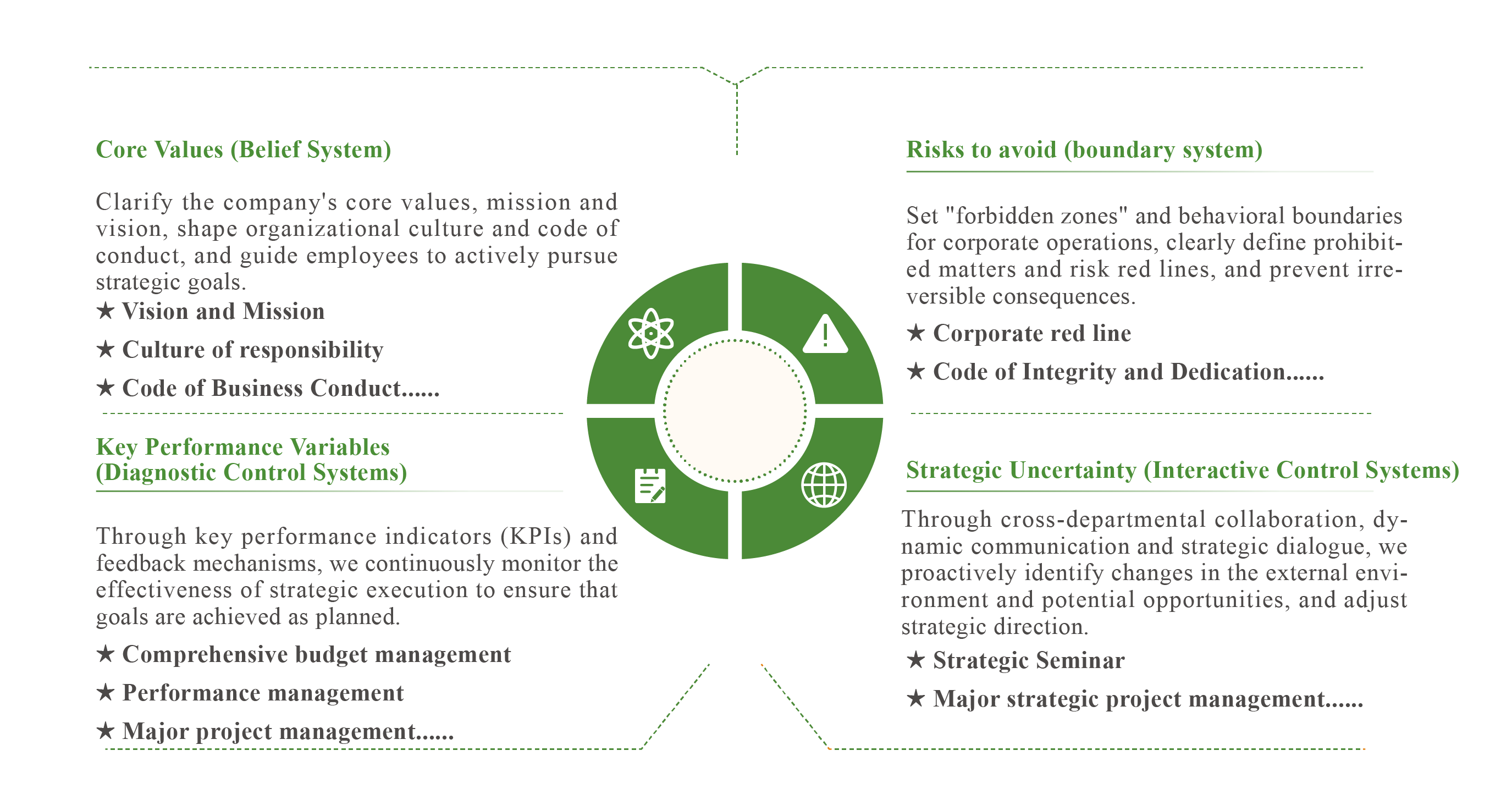 Strategy | Strategic Planning | Formulate corporate strategic goals from top to bottom, break them down, and implement them in all aspects of corporate operations and production to ensure that strategic goals are achieved and continuously optimize the corporate development environment |